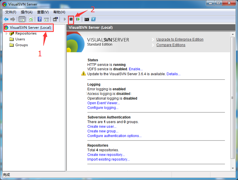 1、启动VisualSVN Server,如下:选择“VisualSVN Server(Local)”,再点击"Stops VisualSVN Server"按钮,停止VisualSVN Server服务。否则,软件将禁止在运行中修改端口。