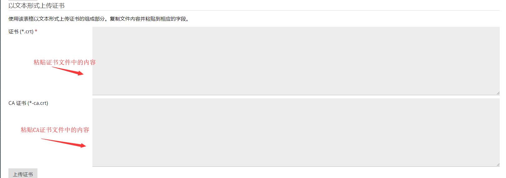 或者详情页面中文本形式上传证书, 复制文件内容并粘贴到相应的字段,粘贴完成后点击【上传证书】按钮。