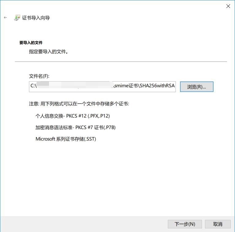 获取.pfx后缀的电子邮件签名证书后,按照以下步骤导入至Windows 10系统中: