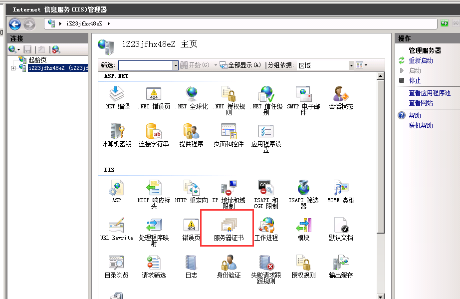 第一步: 首先上传PFX格式证书到服务器桌面,打开IIS管理器. 选择 【服务器证书】